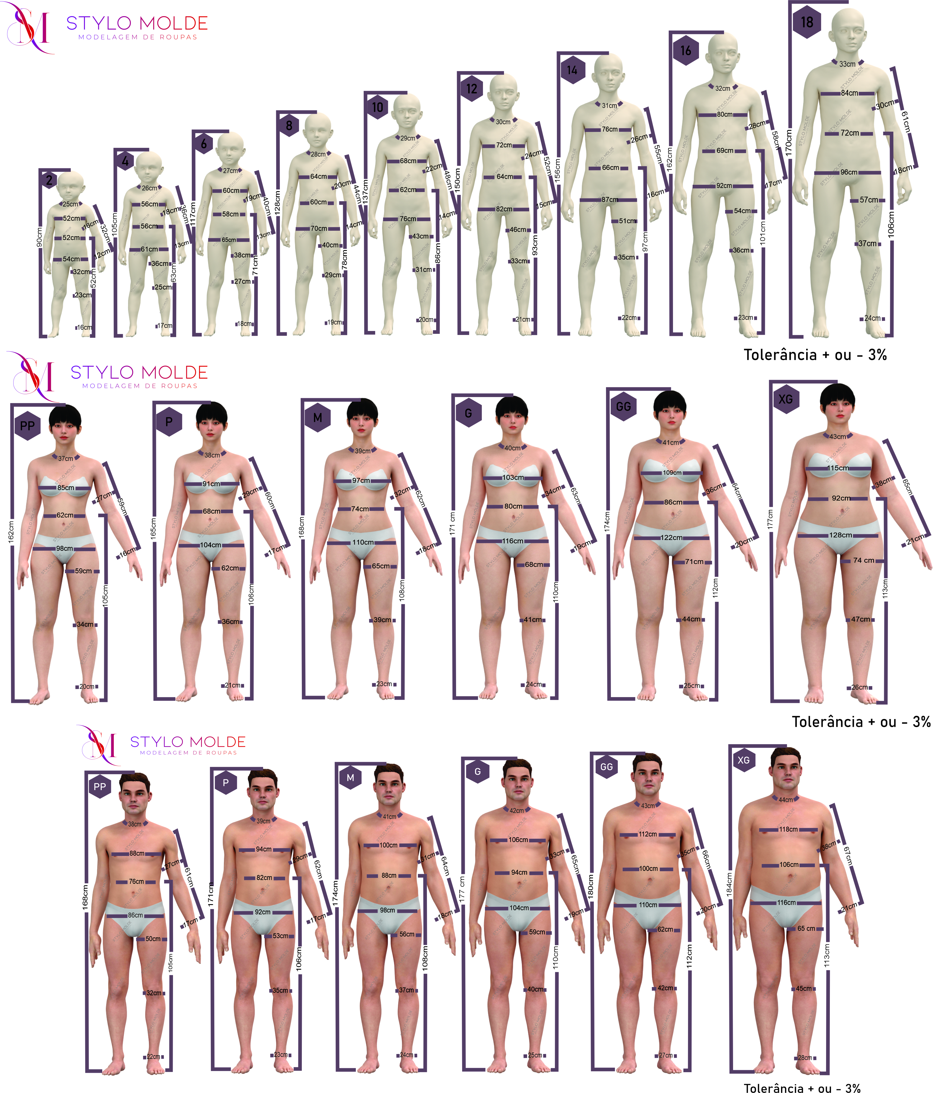 📌 Agora que você já tirou todas as dúvidas e anotou suas medidas, é só comparar com os tamanhos abaixo dos nossos avatares.